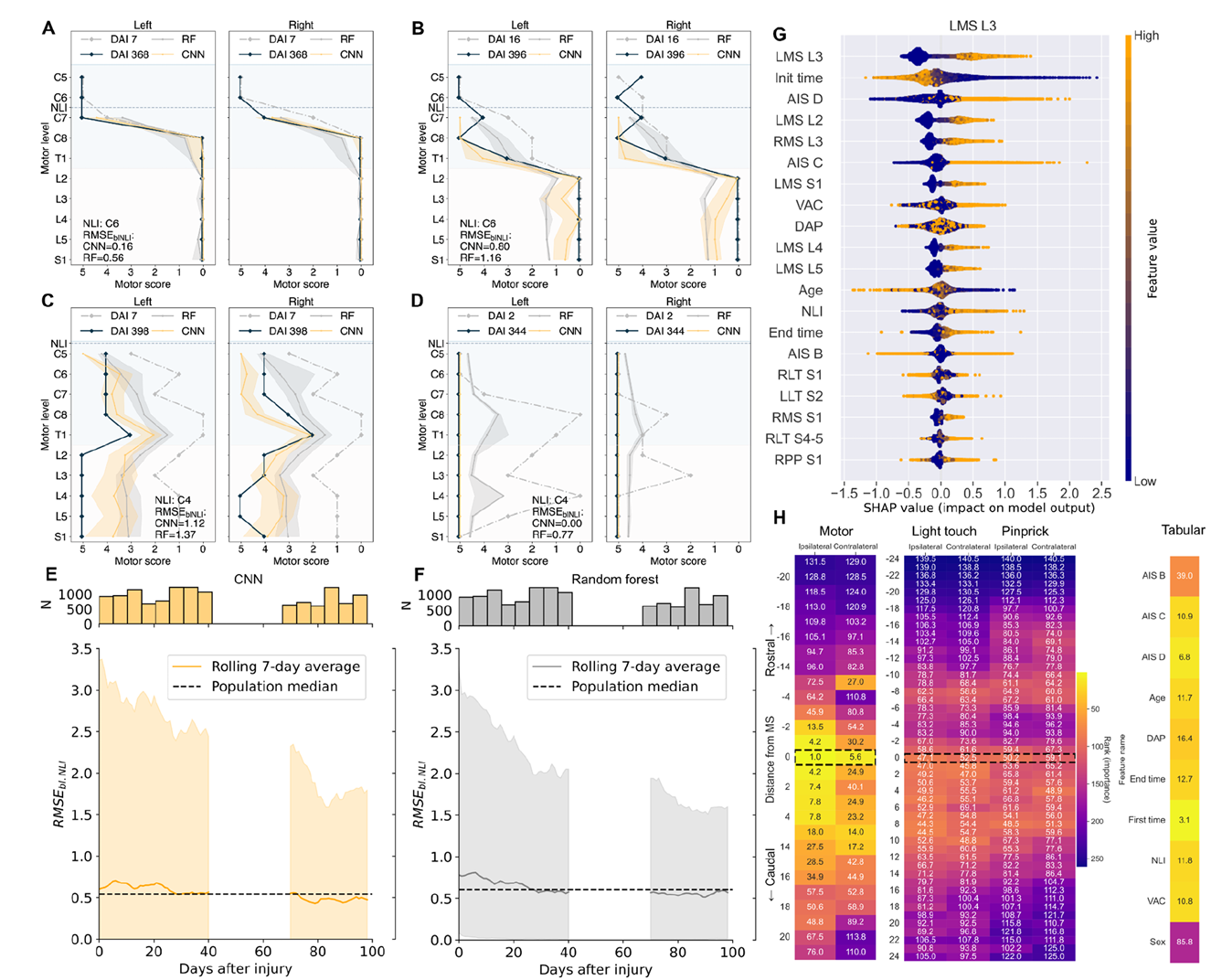 模型基准测试结果表明,卷积神经网络在预测节段运动评分序列方面表现最优,其在EMSCI数据集上的中位低于神经损伤水平均方根误差为0.55,在Sygen外部验证集上同样保持领先,其他模型中随机森林和极端梯度提升树的中位误差分别为0.61,而图神经网络和变换器表现稍逊,深度学习模型普遍优于线性与树模型,尤其在捕捉序列依赖性方面展现优势。代表性患者预测示例显示,卷积神经网络能够准确反映不同严重程度患者的恢复曲线,且预测不确定性随评估时间延后而降低,特征重要性分析揭示初始评估时间、近端运动评分、年龄、美国脊髓损伤协会损害量表分级和神经损伤水平是关键预测因子,运动评分的重要性随其与目标肌节距离的减小而增加,尾侧评分的影响显著高于头侧,而感觉评分重要性相对较低。