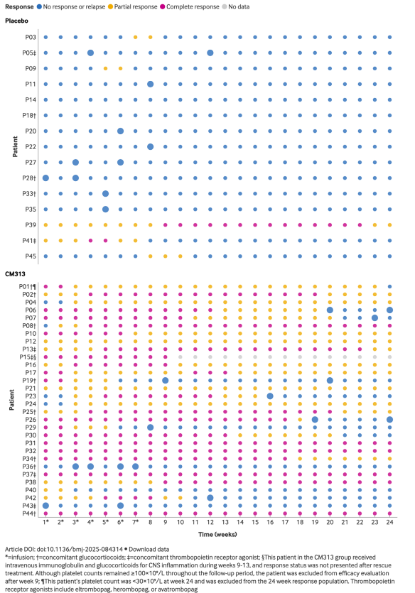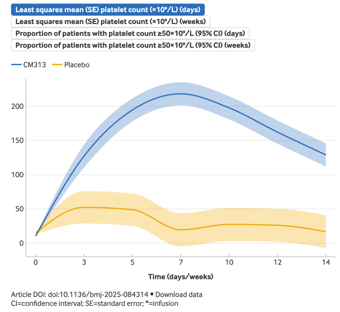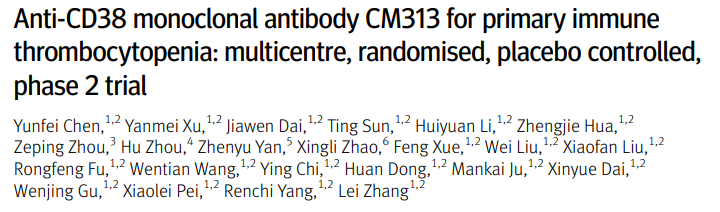 Chen Y, Xu Y, Dai J, et al. Anti-CD38 monoclonal antibody CM313 for primary immune thrombocytopenia: multicentre, randomised, placebo controlled, phase 2 trial. BMJ. 2025;391:e084314. Published 2025 Oct 21. doi:10.1136/bmj-2025-084314