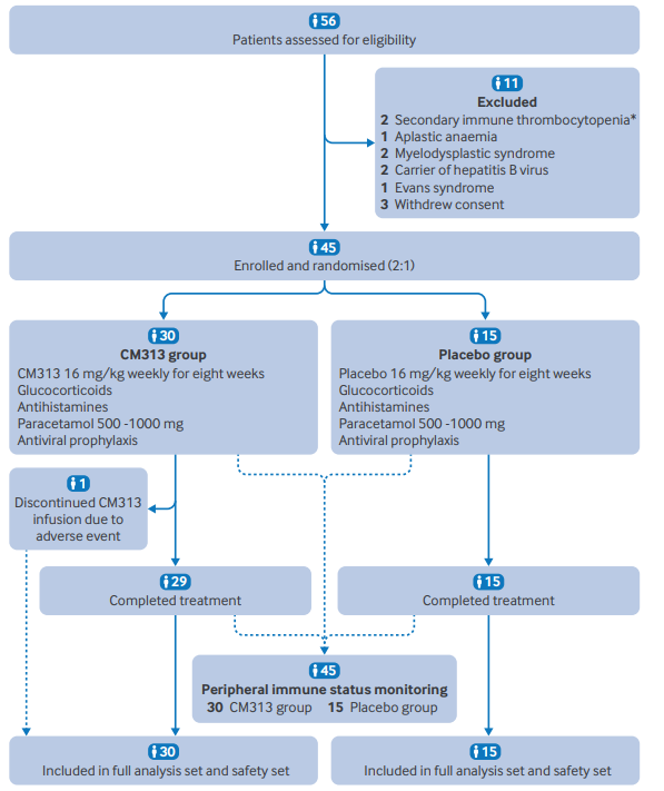 CM313-ITP是一项在中国5家中心进行的随机、安慰剂对照II期临床试验。研究设计包括4周筛选期、8周治疗期和16周随访期。共45例合格患者按2:1比例随机分配至CM313组(n=30)或安慰剂组(n=15)。纳入标准为年龄≥18岁、ITP病程>3个月、筛选期平均血小板计数<30×10⁹/L且无单次>35×10⁹/L、既往对糖皮质激素治疗无效或复发但曾对标准治疗有应答。患者接受每周一次静脉注射CM313(16 mg/kg)或匹配安慰剂,共8周。主要终点为第8周的总应答率(ORR),定义为完全应答或部分应答。