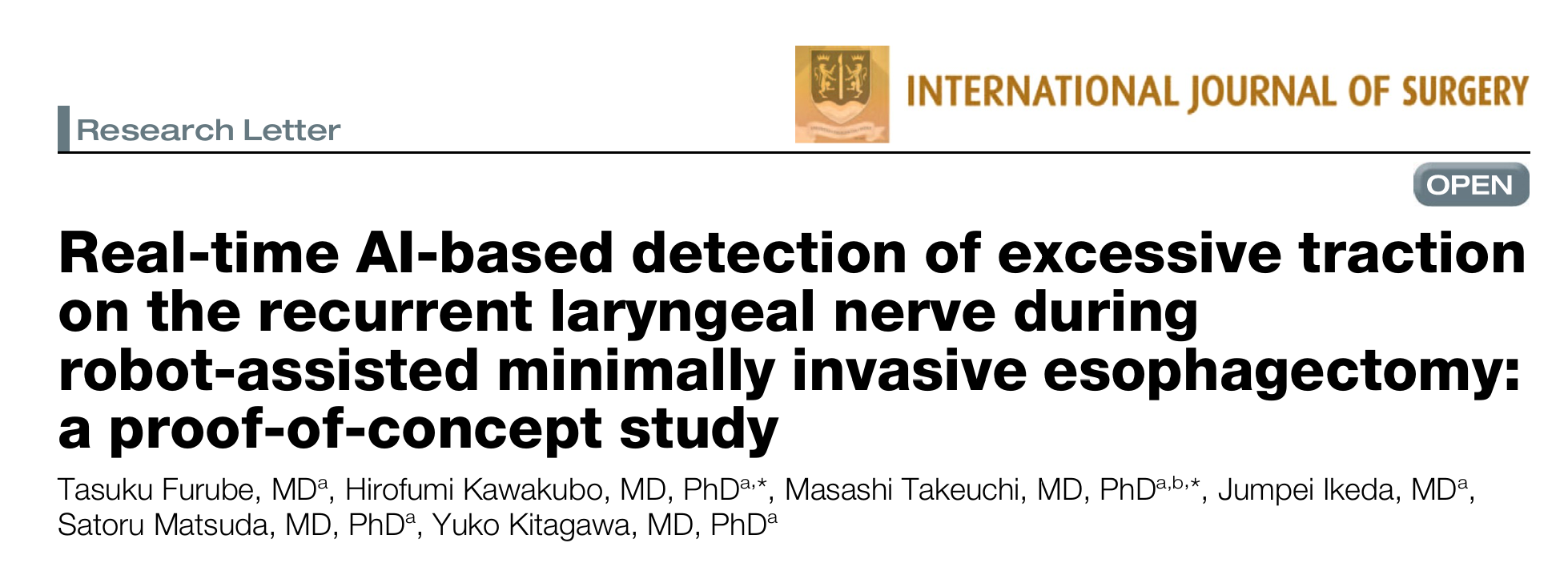 Furube T, Kawakubo H, Takeuchi M, Ikeda J, Matsuda S, Kitagawa Y. Real-time AI-based detection of excessive traction on the recurrent laryngeal nerve during robot-assisted minimally invasive esophagectomy: a proof-of-concept study. Int J Surg 2025;111:7336-7340.