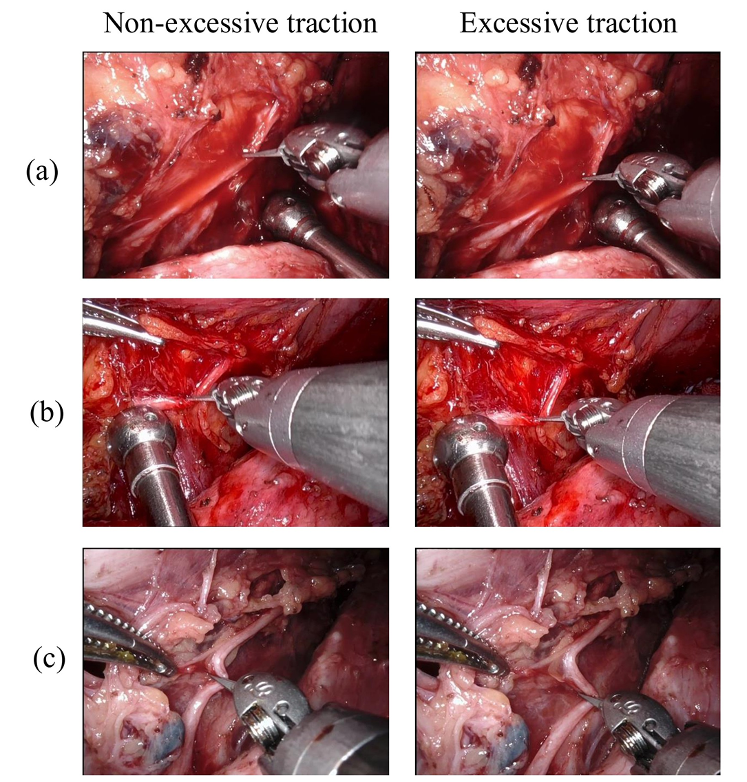 在食管切除术中,喉返神经麻痹是一种常见且严重的并发症,显著影响患者术后生活质量,其主要原因在于手术过程中对神经的过度牵拉。尤其是在机器人辅助微创食管切除术中,左侧喉返神经在淋巴结清扫阶段容易因器械操作不慎而受到意外牵拉。目前临床上常用的神经完整性监测仪能够在神经受损后通过信号振幅下降来提示损伤,但其本质上属于事后检测,无法在神经发生不可逆损伤前提供预警。因此,开发一种能够在术中实时识别过度牵拉的方法,成为提高手术安全性的关键。近年来,人工智能技术在医学影像识别领域取得了显著进展,尤其在解剖结构分割与识别方面展现出潜力。先前已有研究报道了用于机器人辅助食管切除术中喉返神经识别的AI模型,但尚未有系统能够动态监测手术操作中的机械性牵拉风险。本研究在此背景下,旨在扩展现有AI模型的功能,使其能够实时检测左侧喉返神经的过度牵拉,并在神经损伤发生前向外科医生发出预警,从而为术中决策提供支持。