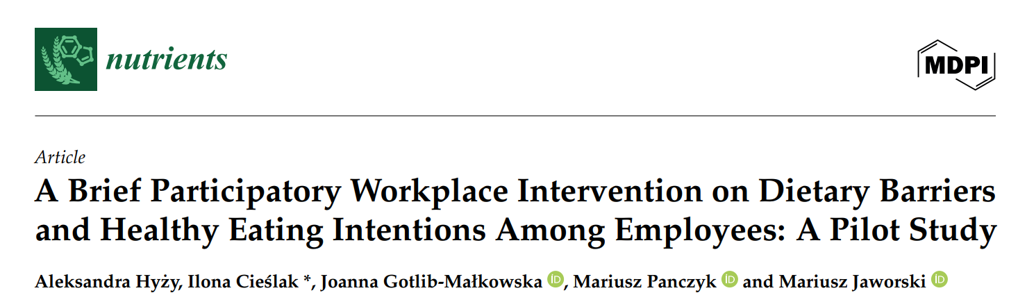 Hyży, A.; Cieślak, I.; Gotlib-Małkowska, J.; Panczyk, M.; Jaworski, M. A Brief Participatory Workplace Intervention on Dietary Barriers and Healthy Eating Intentions Among Employees: A Pilot Study. Nutrients 2025, 17, 3371. https://doi.org/10.3390/nu17213371