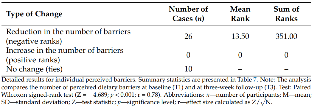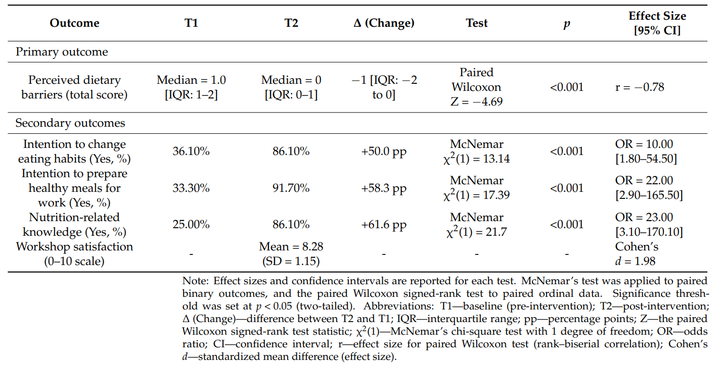 结果显示,干预后三周,参与者报告的饮食障碍中位数从1.0显著降至0。干预后,计划改变饮食习惯的比例从36.1%升至86.1%;计划准备健康工作餐的比例从33.3%升至91.7%。86.1%的参与者认为干预后营养知识有所提升。干预满意度评分为8.28/10,三周后,91.7%的参与者报告至少维持一项饮食改变,86.1%认为准备健康餐食更为容易,75%表示动机稳定或增强。