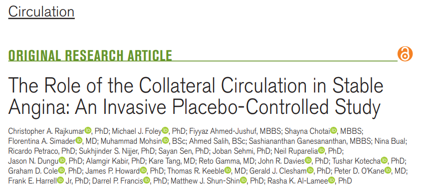 Rajkumar CA, Foley MJ, Ahmed-Jushuf F, et al. The Role of the Collateral Circulation in Stable Angina: An Invasive Placebo-Controlled Study. Circulation. Published online October 27, 2025. doi:10.1161/CIRCULATIONAHA.125.074687