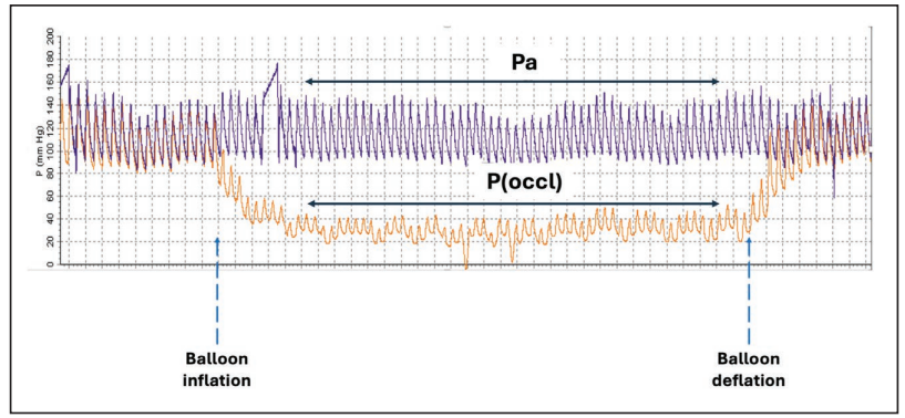 图:在60秒球囊阻塞期间主动脉压力和远端冠状动脉楔压的同步变化