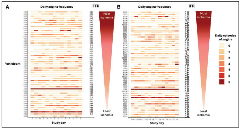 图:通过智能手机应用程序报告的每日心绞痛频率与通过FFR(A)和iFR(B)评估的生理学狭窄严重程度之间的关联