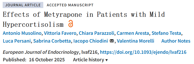 Antonio Musolino, Vittoria Favero, Chiara Parazzoli, Carmen Aresta, Stefano Testa, Luca Persani, Sabrina Corbetta, Iacopo Chiodini, Valentina Morelli, Effects of Metyrapone in Patients with Mild Hypercortisolism, European Journal of Endocrinology, 2025;, lvaf216, https://doi.org/10.1093/ejendo/lvaf216