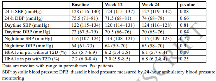 治疗24周后,40%(8/20)的患者实现了主要终点,即24小时平均收缩压下降≥5 mmHg,且未增加降压药物。其中,基线收缩压较高的患者改善更为明显。日间和夜间收缩压分别有45%和35%的患者得到改善(p < 0.05),而舒张压改善率较低(20%)。此外,2例基线非杓型血压患者恢复了正常节律。