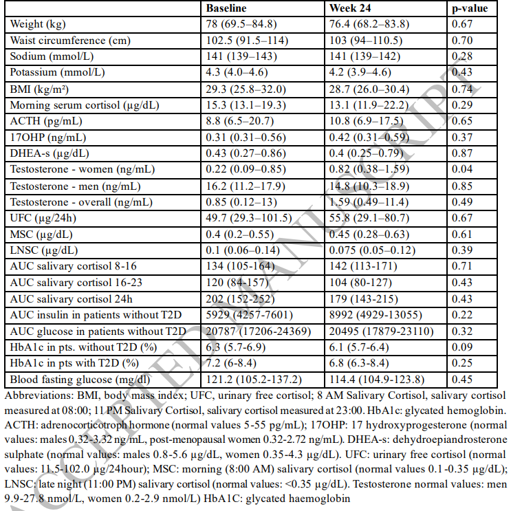 唾液皮质醇曲线下面积(AUC)在治疗前后无显著变化,但观察到晨间皮质醇略升高、夜间略降低的趋势,提示昼夜节律有向生理模式恢复的倾向。其他激素参数如ACTH、UFC、DHEA-s等均无显著变化,仅女性睾酮水平略有上升(p = 0.04),但未超出正常范围。
