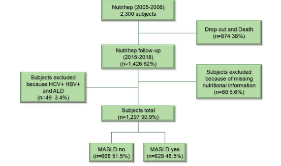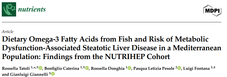 代谢功能障碍相关脂肪性肝病(MASLD)是全球最常见的慢性非传染性疾病之一,影响约1/3成年人群,在意大利的患病率估计为20%–40%,在肥胖和2型糖尿病群体中甚至高达50%–90%。目前,生活方式干预仍是MASLD最有效的治疗策略。Omega-3脂肪酸因其抗炎、抗氧化、抗纤维化及改善胰岛素敏感性的作用,被认为在肝脏健康中具有保护潜力。然而,既往关于Omega-3补充剂的研究结果不一,而来自天然食物(如鱼类)的Omega-3与MASLD的关系在地中海人群中尚缺乏系统研究。