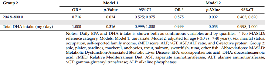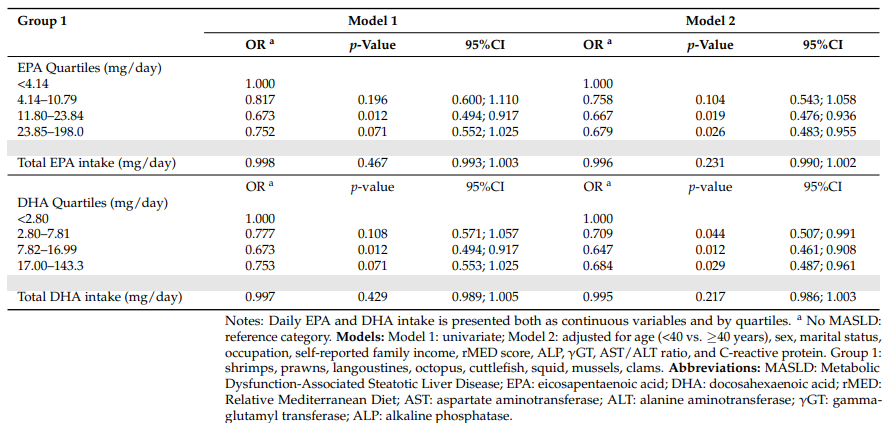 表:通过逻辑回归分析,研究第1组中EPA和DHA摄入量与MASLD的关联