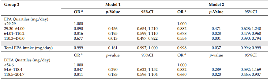 表:通过逻辑回归分析,研究第2组中EPA和DHA摄入量与MASLD的关联性