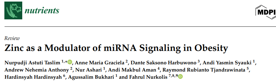 Taslim, N.A.; Graciela, A.M.; Harbuwono, D.S.; Syauki, A.Y.; Anthony, A.N.; Ashari, N.; Aman, A.M.; Tjandrawinata, R.R.; Hardinsyah, H.; Bukhari, A.; et al. Zinc as a Modulator of miRNA Signaling in Obesity. Nutrients 2025, 17, 3375. https://doi.org/10.3390/nu17213375