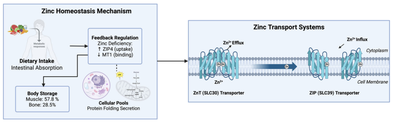 锌是300多种酶的辅因子,广泛参与DNA复制、转录调控及细胞信号转导。其细胞内稳态主要由两类转运蛋白调控:ZIP(SLC39)家族促进锌离子内流,ZnT(SLC30)家族则介导锌外排或区室化储存。锌在肌肉(57.8%)和骨骼(28.5%)中储量最高,而肠道吸收受ZIP4和金属硫蛋白(MT1)反馈调节。肥胖患者常伴血清锌水平下降及锌转运蛋白表达异常,导致免疫功能受损和炎症反应增强。研究显示,ZnT8编码基因SLC30A8的突变与2型糖尿病风险相关,ZIP13敲除影响米色脂肪形成,提示锌转运系统在代谢综合征中的核心地位。