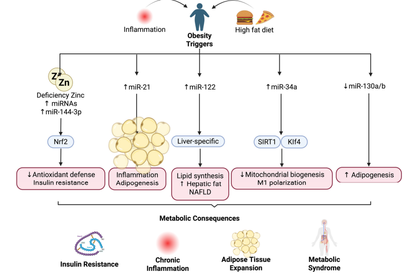 综上所述,锌通过调控miRNA网络,在肥胖及相关代谢疾病中扮演着“分子开关”角色。维持锌稳态有助于恢复代谢相关miRNA表达,改善胰岛素敏感性与炎症状态。未来,基于“锌–miRNA轴”的精准营养策略,结合循环miRNA生物标志物,有望为肥胖防治提供新途径,推动营养基因组学向临床实践转化。