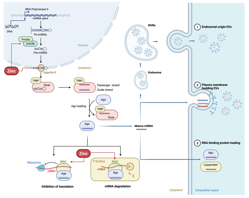 图:锌通过调控miRNA生物合成的多个关键步骤(包括Drosha和Dicer的活性、Exportin-5的运输以及RISC复合物的形成),进而影响mRNA的翻译和降解过程