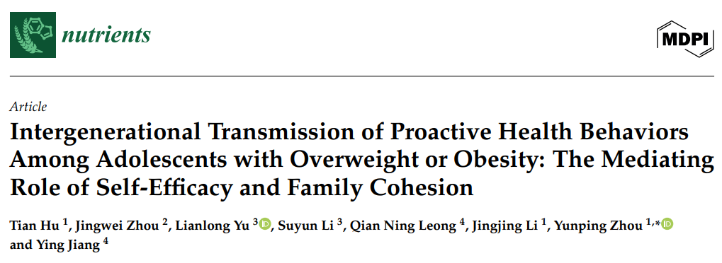 Hu, T.; Zhou, J.; Yu, L.; Li, S.; Leong, Q.N.; Li, J.; Zhou, Y.; Jiang, Y. Intergenerational Transmission of Proactive Health Behaviors Among Adolescents with Overweight or Obesity: The Mediating Role of Self-Efficacy and Family Cohesion. Nutrients 2025, 17, 3377. https://doi.org/10.3390/nu17213377