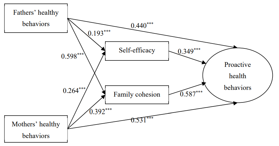 结果揭示了清晰的作用路径。首先,在调整所有协变量后,父亲与母亲的健康行为均与青少年的积极健康行为呈显著正相关(父亲:β = 0.442, 95% CI: 0.263–0.620;母亲:β = 0.525, 95% CI: 0.336–0.714)。更重要的是,中介分析表明,父母健康行为不仅具有直接效应,还通过两条间接路径发挥作用:其一是通过提升青少年的自我效能(父亲行为→自我效能→积极健康行为:β = 0.096;母亲行为→自我效能→积极健康行为:β = 0.101),其二是通过增强家庭凝聚力(父亲行为→家庭凝聚力→积极健康行为:β = 0.441;母亲行为→家庭凝聚力→积极健康行为:β = 0.246)。这些路径均具有统计学显著性(p < 0.001)。