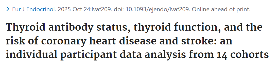 Ola Hysaj, Orestis Efthimiou, Tinh-Hai Collet, Anne R Cappola, Heba Alwan, Jacobijn Gussekloo, Layal Chaker, Maryam Kavousi, Fereidoun Azizi, Anna Köttgen, Elizabeth Selvin, Stella Trompet, John P Walsh, Suzanne J Brown, Massimo Iacoviello, Robin P F Dullaart, Stephan J L Bakker, José A Sgarbi, Till Ittermann, Henry Völzke, Isabela M Benseñor, Sergio Valdés, Cristina Maldonado-Araque, Bruce M Psaty, Frank J Wolters, Bjørn O Åsvold, Cinzia Del Giovane, Nicolas Rodondi, for the Thyroid Studies Collaboration, Thyroid antibody status, thyroid function, and the risk of coronary heart disease and stroke: an individual participant data analysis from 14 cohorts, European Journal of Endocrinology, 2025;, lvaf209, https://doi.org/10.1093/ejendo/lvaf209