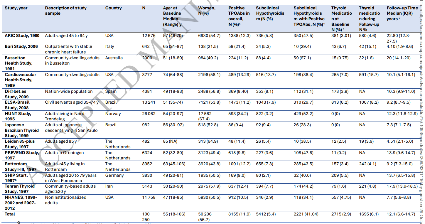 研究团队系统检索了截至2024年11月的MEDLINE、EMBASE及Cochrane Library数据库,并联合甲状腺研究协作组已有的队列资源,最终纳入14项符合条件的前瞻性队列研究。共包含100,250名成年人(中位年龄55岁,女性占56.7%),中位随访时间达12.1年。基线时,11.9%的参与者为TPOAb阳性,5.4%患有亚临床甲减,其中41%的亚临床甲减患者同时为TPOAb阳性。