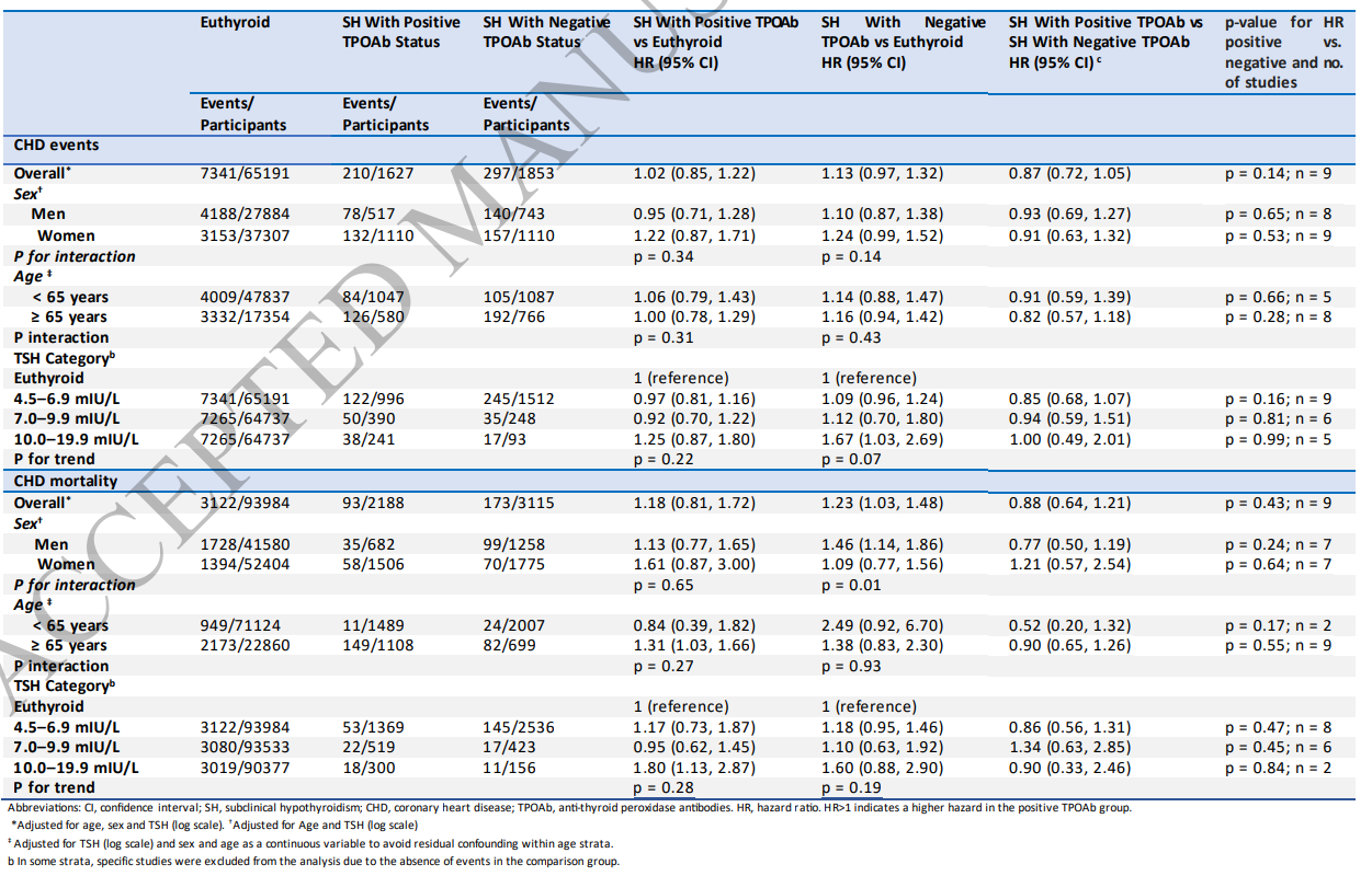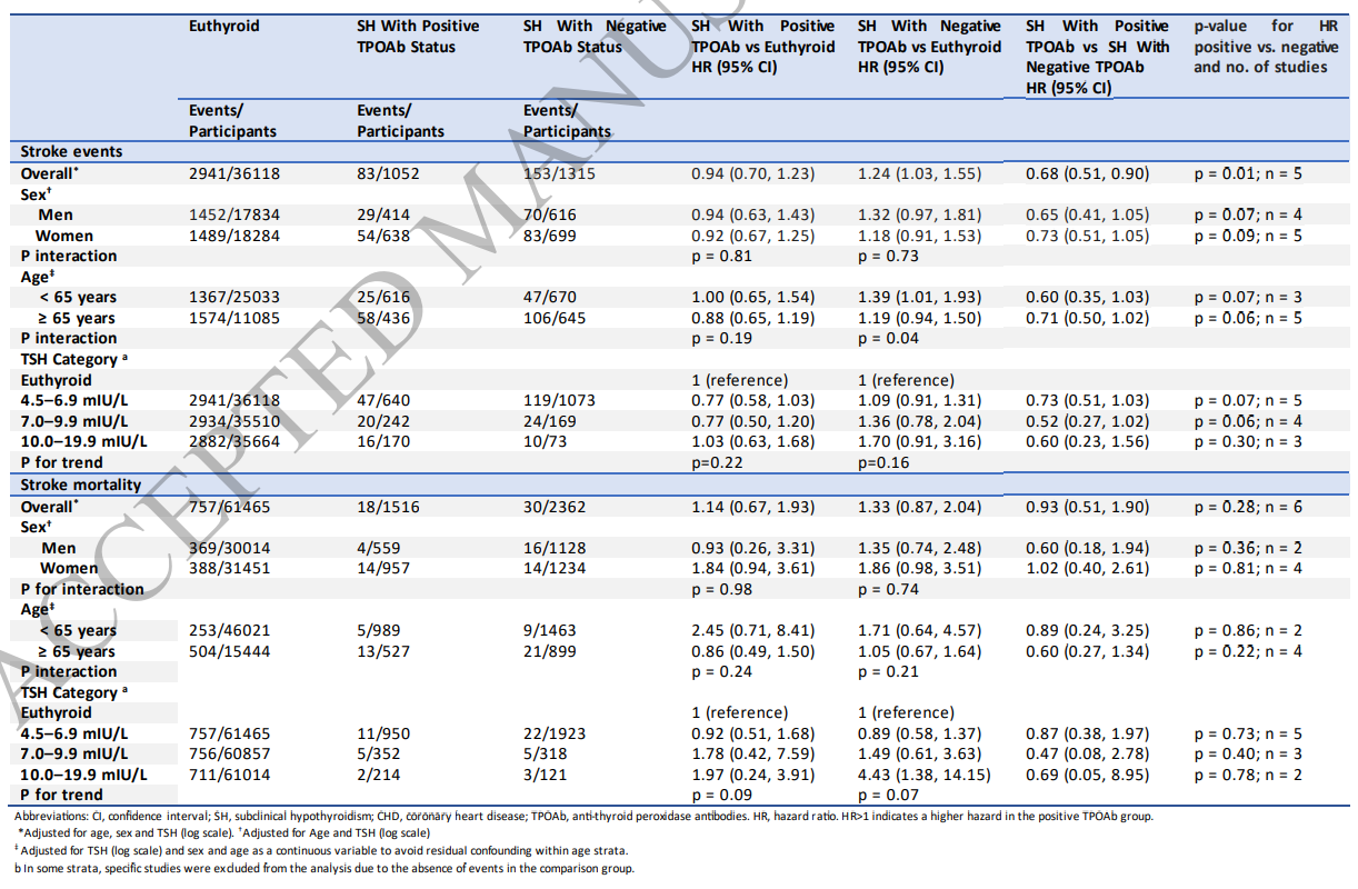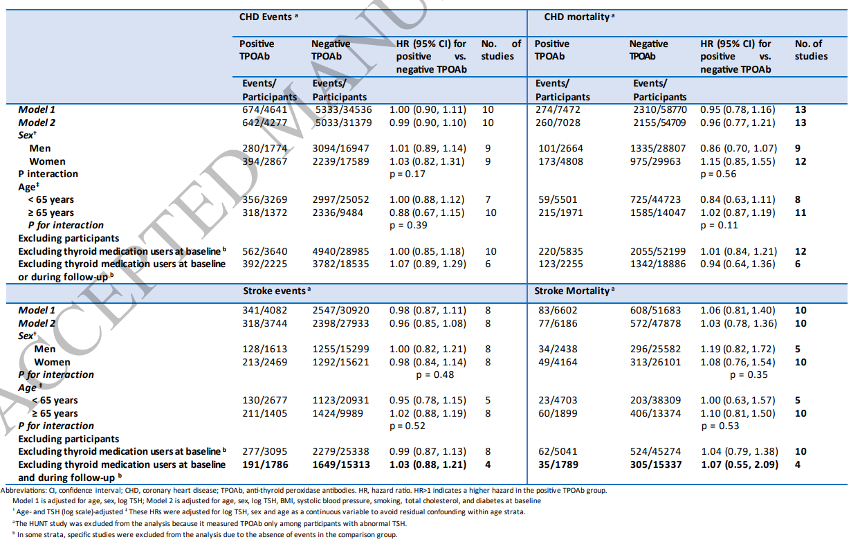 总之,本研究是迄今规模最大、方法最严谨的探讨TPOAb与心血管结局关联的IPD荟萃分析。其核心结论是:在总体人群或亚临床甲减患者中,TPOAb阳性状态并非冠心病或卒中事件的独立危险因素。