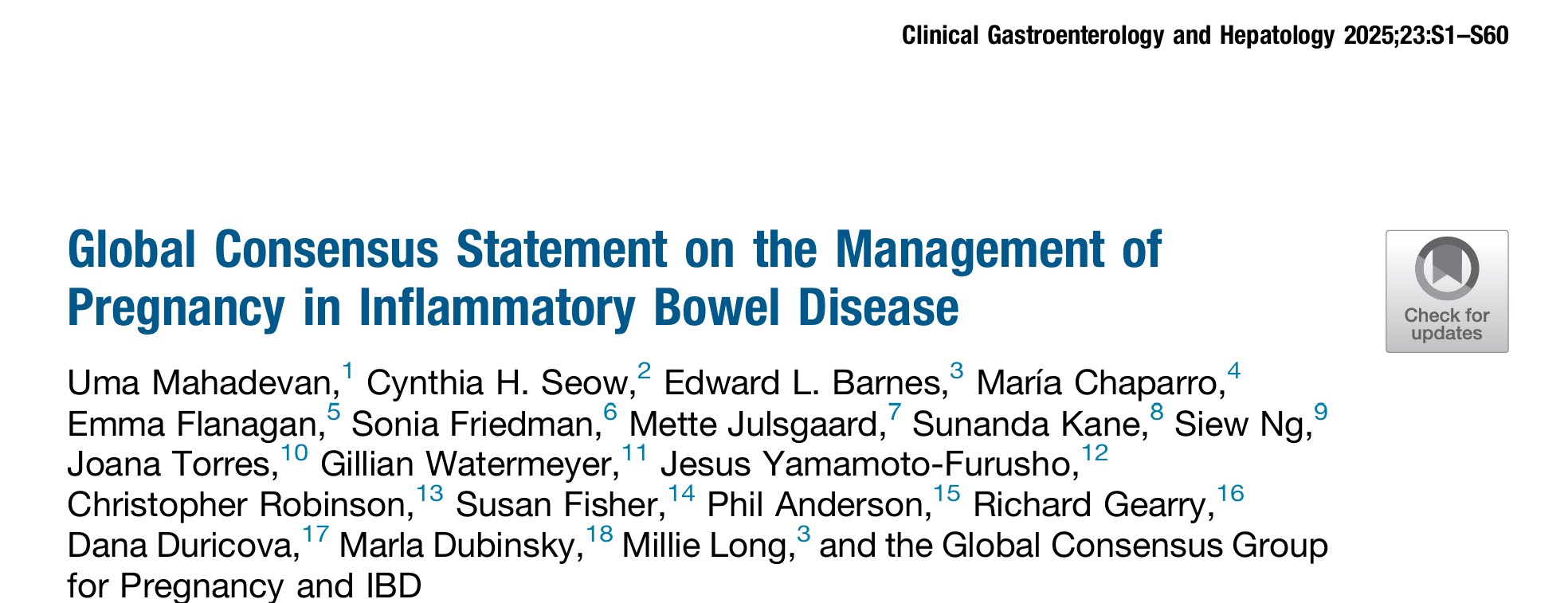 Mahadevan U, Seow CH, Barnes EL, Chaparro M, Flanagan E, Friedman S, Julsgaard M, Kane S, Ng S, Torres J, Watermeyer G, Yamamoto-Furusho J, Robinson C, Fisher S, Anderson P, Gearry R, Duricova D, Dubinsky M, Long M, and the Global Consensus Group for Pregnancy and IBD. Global Consensus Statement on the Management of Pregnancy in Inflammatory Bowel Disease. Clinical Gastroenterology and Hepatology 2025;23:S1–S60.