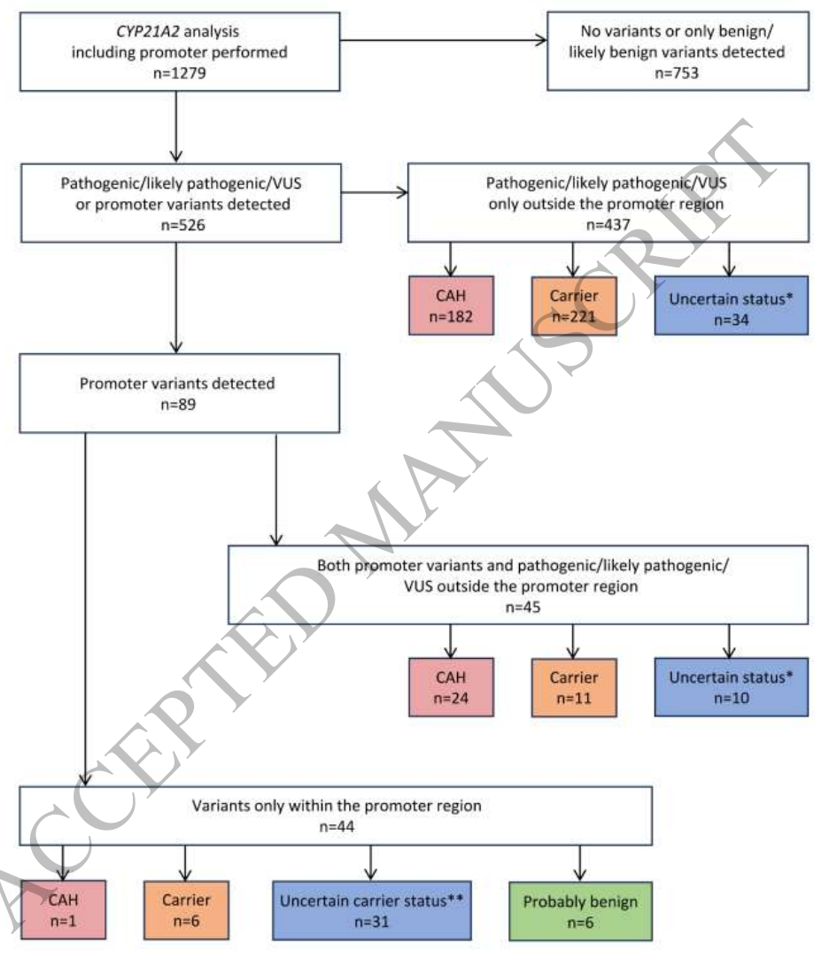 在1279例受试者中,89例(7.0%)携带潜在致病性启动子变异。在207例确诊为经典或非经典21-OHD的患者中,25例(12.1%)携带启动子变异。此外,52例携带者在另一等位基因上未发现其他CYP21A2突变,提示启动子变异可能单独致病或影响携带者状态。