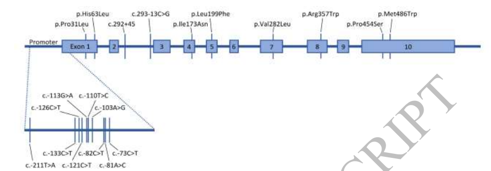 示意图:CYP21A2 基因结构及本研究中检测到的所有变异位点