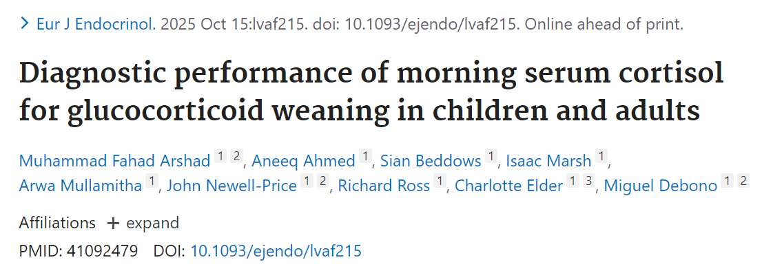 糖皮质激素广泛用于治疗炎症性疾病和恶性肿瘤,长期使用可抑制下丘脑-垂体-肾上腺轴(HPA轴),导致糖皮质激素诱导的肾上腺功能不全(GIAI)。目前,欧洲内分泌学会(ESE)与内分泌学会(ES)联合指南及英国国家卫生与临床优化研究所(NICE)均推荐采用早晨血清皮质醇(EMC)作为评估HPA轴功能的一线工具,以减少对动态试验如短效Synacthen试验(SST)的依赖。然而,关于EMC在糖皮质激素减停过程中具体截断值的研究仍较为匮乏。本研究首次基于现代免疫分析法,系统评估了儿童与成人患者中EMC预测SST结果的能力,为临床实践提供了重要依据。