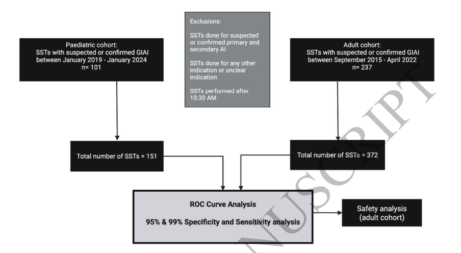 本研究为一项回顾性观察性队列研究,纳入英国谢菲尔德两家医院在2019年至2024年间进行的151例儿童SST和2015年至2022年间372例成人SST。所有患者均因长期使用糖皮质激素(成人≥5 mg/d泼尼松或等效剂量≥4周,儿童可能更低剂量≥3周)而接受SST以评估GIAI。SST合格标准定义为注射Synacthen后30分钟血清皮质醇≥430 nmol/L(15.6 μg/dL)。EMC作为SST前0分钟皮质醇值进行采集,儿童样本使用Vitros 5600分析仪,成人样本使用Roche Elecsys Cortisol II分析仪,ACTH测定采用Siemens Immulite 2000化学发光法。研究通过受试者操作特征曲线分析评估EMC、ACTH及皮质醇/ACTH比值对SST结果的预测能力,并计算了95%和99%灵敏度与特异性对应的截断值。