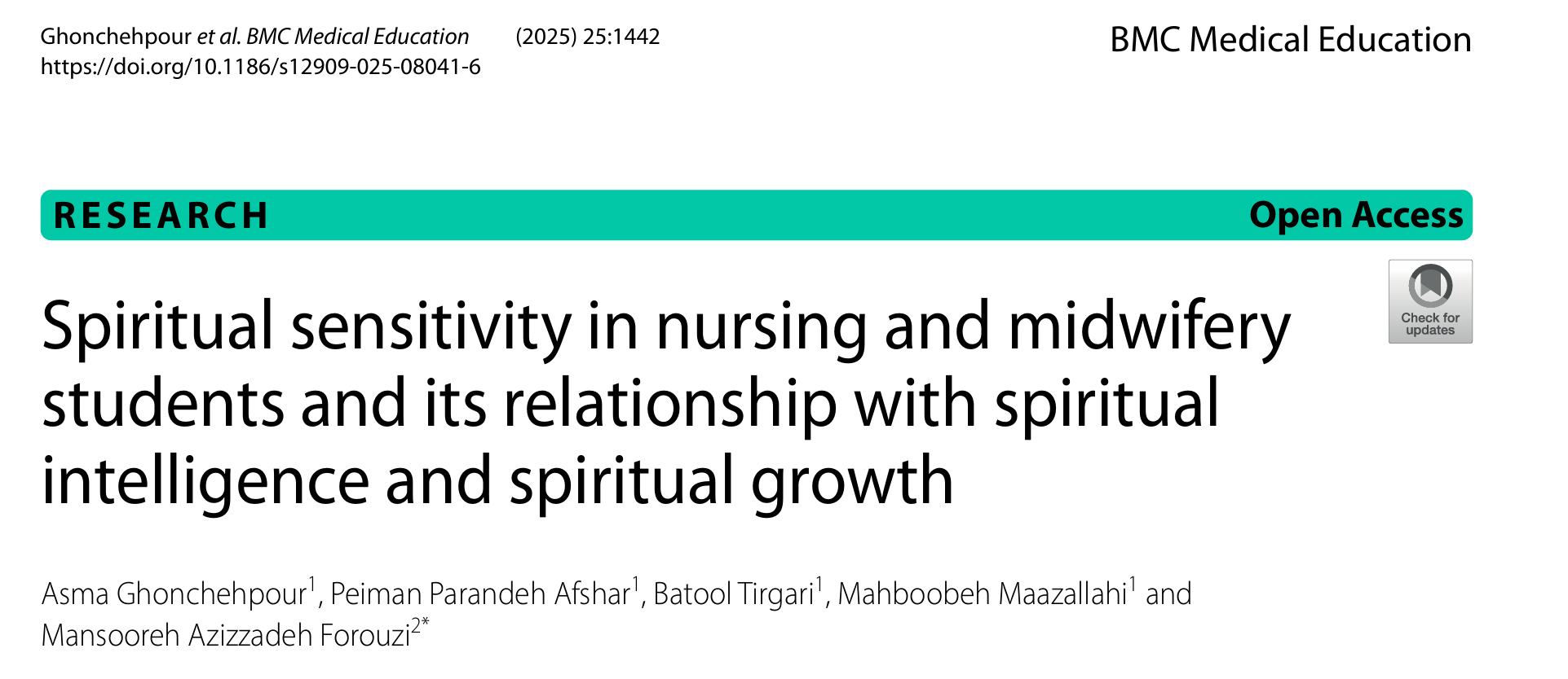 Ghonchehpour, A., Parandeh Afshar, P., Tirgari, B., Maazallahi, M., & Forouzi, M. A. (2025). Spiritual sensitivity in nursing and midwifery students and its relationship with spiritual intelligence and spiritual growth. *BMC Medical Education*, *25*, 1442. https://doi.org/10.1186/s12909-025-08041-6