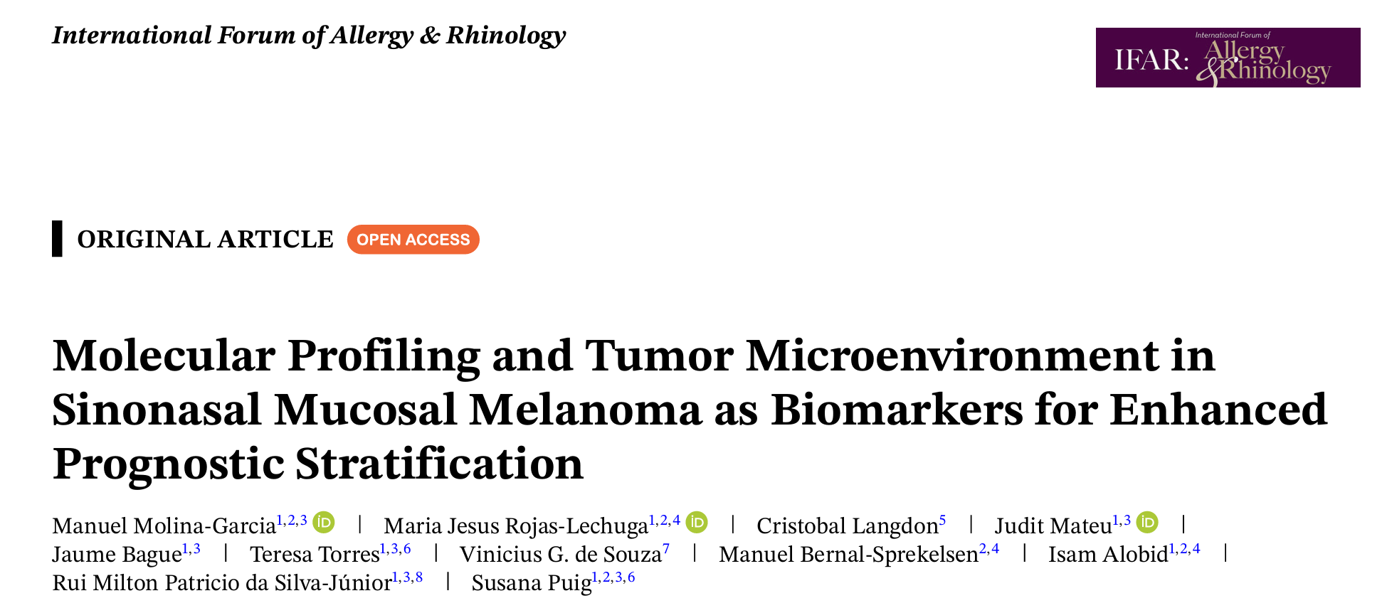 Molina-Garcia, M., Rojas-Lechuga, M. J., Langdon, C., Mateu, J., Bague, J., Torres, T., de Souza, V. G., Bernal-Sprekelsen, M., Alobid, I., da Silva-Júnior, R. M. P., & Puig, S. (2025). Molecular Profiling and Tumor Microenvironment in Sinonasal Mucosal Melanoma as Biomarkers for Enhanced Prognostic Stratification. International Forum of Allergy & Rhinology, 15, 1082–1093. https://doi.org/10.1002/alt.25606