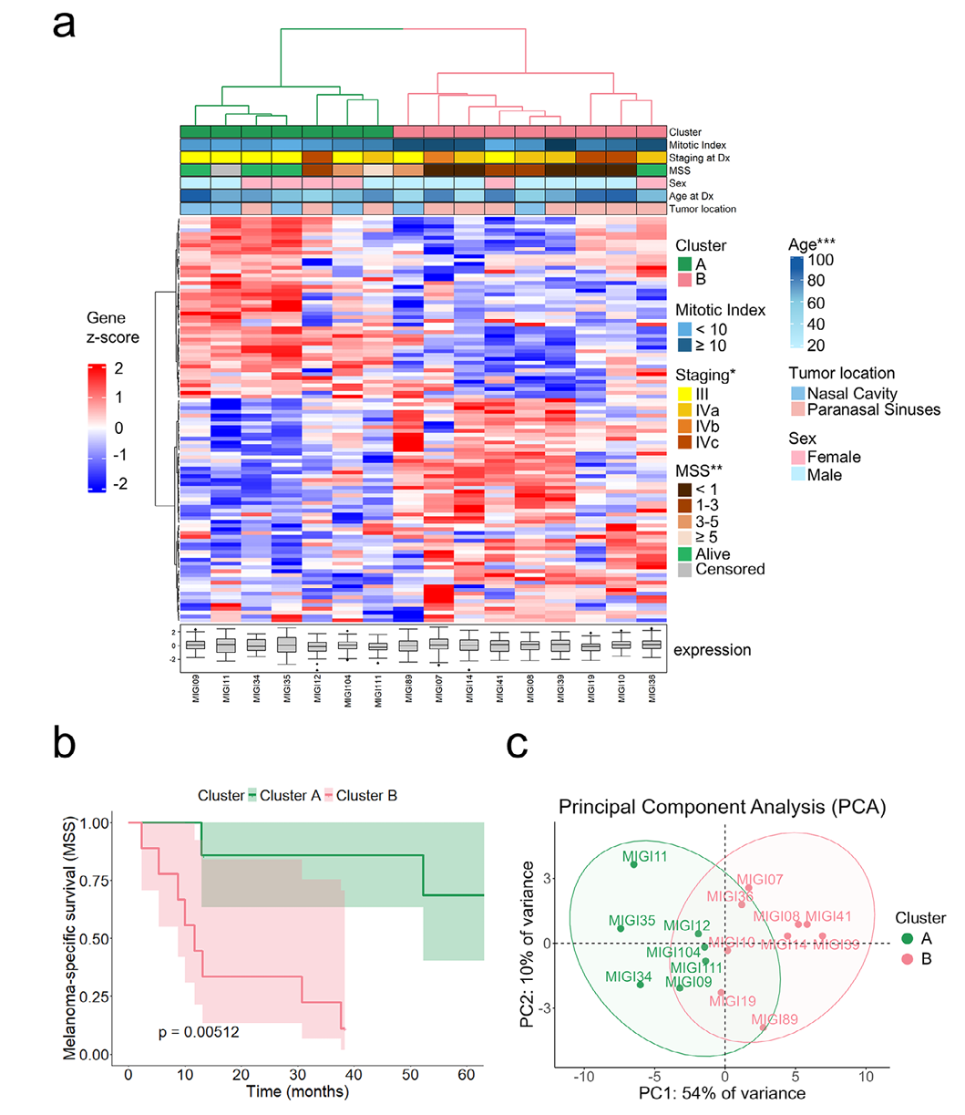中位随访期为22.1个月,局部复发率为43.8%,中位复发时间为12.9个月,远处转移率为50%,中位转移时间为11.4个月,常见转移部位包括肺(4例)和脑(4例),其次为肝(3例)、腰椎(2例)以及脾和腹膜(各1例)。黑色素瘤特异性生存的中位值为30.8个月,1年、3年和5年生存率分别为56.3%、49.2%和33.8%。分子分析中,对数秩检验识别出107个与生存显著相关的基因(p<0.05),其中前10个基因的Kaplan-Meier曲线显示出明显的生存差异。层次聚类基于这些基因将患者分为两个主要簇:簇A与较好预后相关,中位生存为81.74个月(四分位距32.82-92.44),而簇B预后较差,中位生存仅11.73个月(四分位距8.74-30.78),两组间生存差异显著(p=0.0051)。