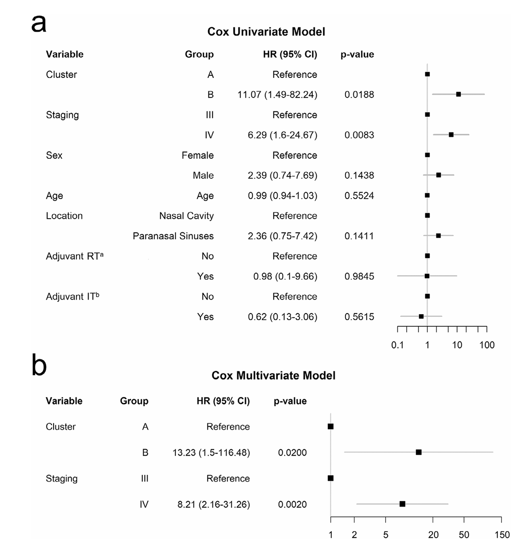 进一步亚聚类分析在簇A内识别出A1和A2,簇B内识别出B1和B2,其中A1亚簇预后最佳(中位生存82.30个月,四分位距64.64-87.65),B1亚簇预后最差(中位生存11.58个月,四分位距9.05-26.38),p=0.00594。bootstrap分析支持聚类结构的稳定性,主分支簇A和簇B的值分别为95和93,亚簇A1、A2、B1和B2的值分别为78、93、94和94。主成分分析显示,第一主成分解释了54%的总方差,第二主成分解释10%,簇A和簇B沿第一主成分明显分离,进一步验证了分子分类的有效性。临床变量比较中,簇B的有丝分裂指数显著高于簇A(中位数13 vs 3,p=0.008),而性别、年龄、肿瘤位置和分期在两组间无统计学差异,尽管簇B中男性比例较高(77.8% vs 42.9%)和鼻窦肿瘤更多(77.8% vs 42.9%)的趋势值得注意。Cox单变量分析显示分期(风险比6.29,95%置信区间1.6-24.67,p=0.0083)和分子簇(风险比11.07,95%置信区间1.49-82.24,p=0.0188)与生存显著相关,多变量分析进一步确认分期(风险比8.21,95%置信区间2.16-31.26,p=0.002)和分子簇(风险比13.23,95%置信区间1.503-116.48,p=0.02)为独立的预后预测因子。