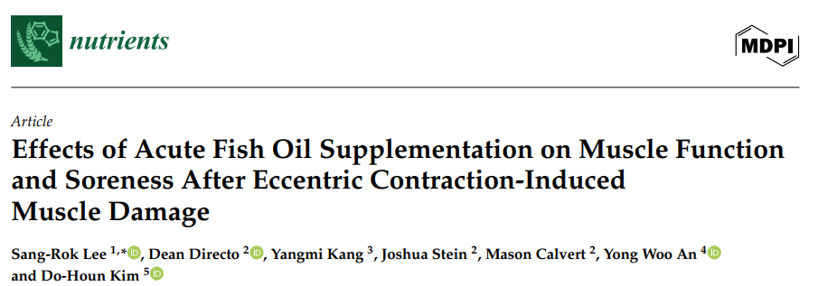 Lee, S.-R.; Directo, D.; Kang, Y.; Stein, J.; Calvert, M.; An, Y.W.; Kim, D.-H. Effects of Acute Fish Oil Supplementation on Muscle Function and Soreness After Eccentric Contraction-Induced Muscle Damage. Nutrients 2025, 17, 3408. https://doi.org/10.3390/nu17213408