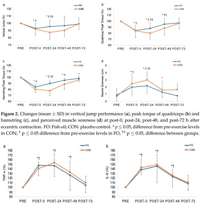 总之,本研究表明,急性高剂量鱼油补充(每日EPA 2100 mg + DHA 720 mg)可适度促进运动性肌肉损伤后的肌肉功能恢复,减轻延迟性肌肉酸痛,并可能通过抗炎机制优化恢复过程。这一发现为运动员及健身爱好者在高强度训练后使用鱼油作为恢复辅助策略提供了初步依据。未来需进一步探索其剂量-效应关系与作用机制,以优化临床应用效果。