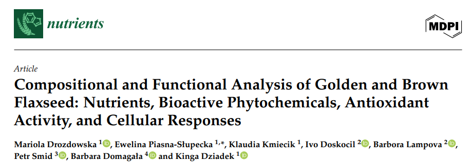 Drozdowska, M.; Piasna-Słupecka, E.; Kmiecik, K.; Doskocil, I.; Lampova, B.; Smid, P.; Domagała, B.; Dziadek, K. Compositional and Functional Analysis of Golden and Brown Flaxseed: Nutrients, Bioactive Phytochemicals, Antioxidant Activity, and Cellular Responses. Nutrients 2025, 17, 3407. https://doi.org/10.3390/nu17213407