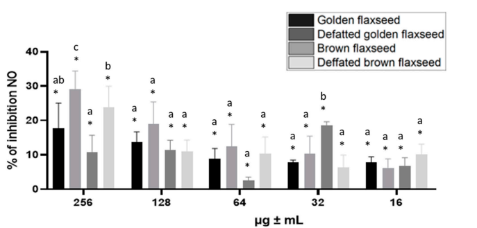 图:亚麻籽提取物(16、32、64、128 和 256 µg/mL)对脂多糖(LPS,1 µg/mL)刺激的 RAW264.7 小鼠巨噬细胞一氧化氮生成的抑制能力