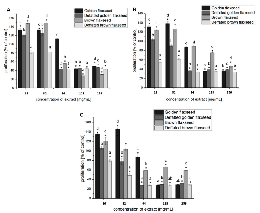 图:亚麻籽提取物(16、32、64、128 和 256 µg/mL)对 MCF-7 乳腺癌细胞增殖的影响,通过细胞增殖 ELISA BrdU 检测法测定