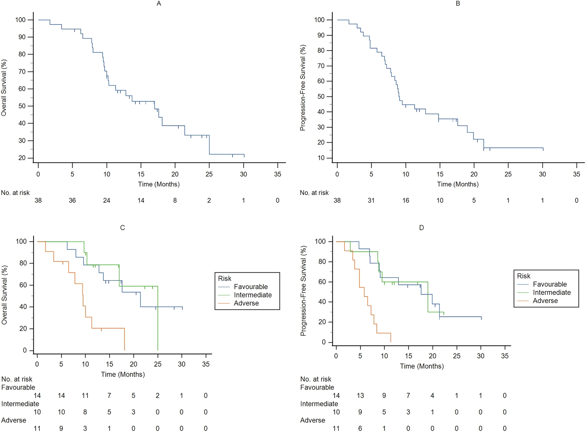 结果显示,诱导治疗后,VAG方案的复合完全缓解率(CRc,含CR和CRi)为81.6%(31/38)。其中63.2%(24/38)患者达到CR,18.4%(7/38)达到CRi。各风险组CRc率分别为:良好风险组92.9%,中间风险组80.0%,不良风险组63.6%,差异无统计学意义。MRD阴性率高达88.0%,各风险组分别为良好风险90.0%、中间100.0%、不良83.3%。具有RUNX1::RUNX1T1融合基因的5例患者中,2例达CR,3例达CRi,一例于巩固期间接受异基因造血干细胞移植后实现分子学完全缓解。中位随访20.5个月,中位总生存期(OS)为17.0个月,CRc患者OS显著优于非CRc患者(18.1 vs. 10.3个月)。不同风险组间OS差异显著,其中良好及中间风险组生存优于不良风险组。中位无进展生存期(PFS)为9.0个月,CRc患者PFS长于非CRc(11.3 vs. 4.8个月)。1年OS和PFS分别为59.2%和41.9%。