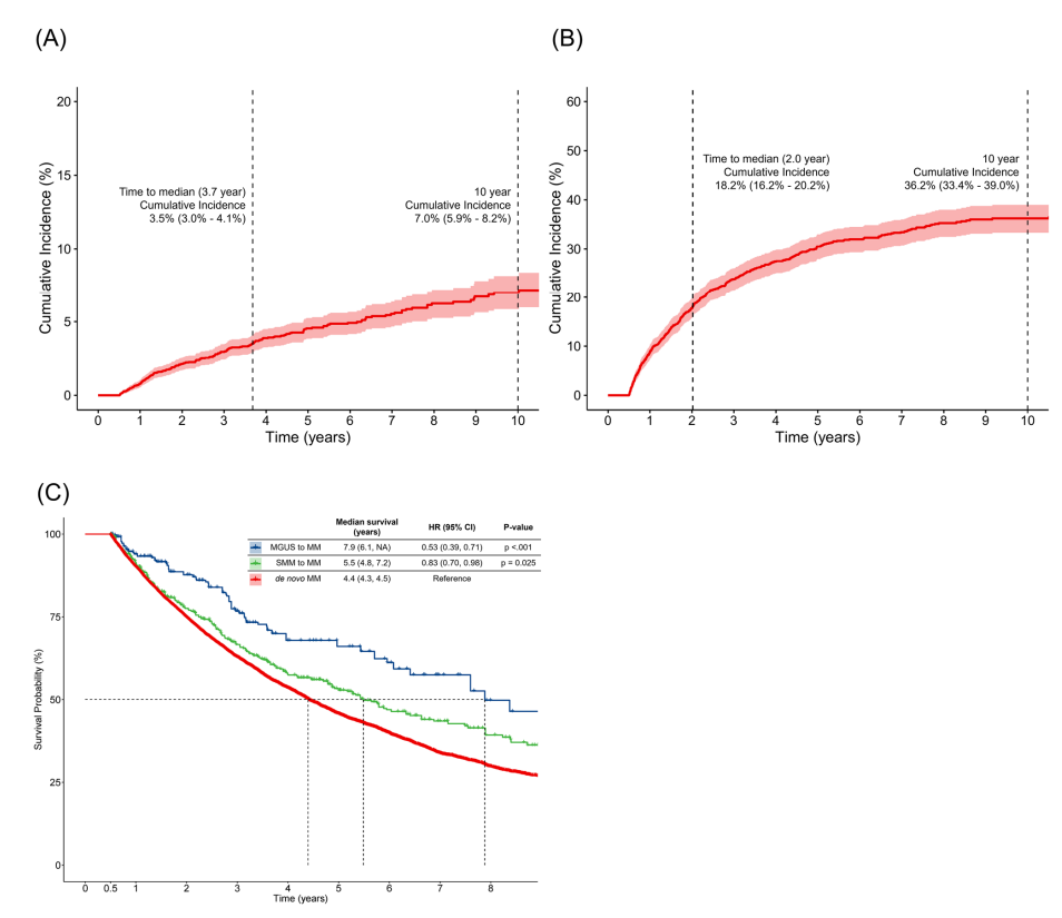 图:从MGUS和SMM队列进展到多发性骨髓瘤以及MGUS、SMM和原发性MM队列的总生存期