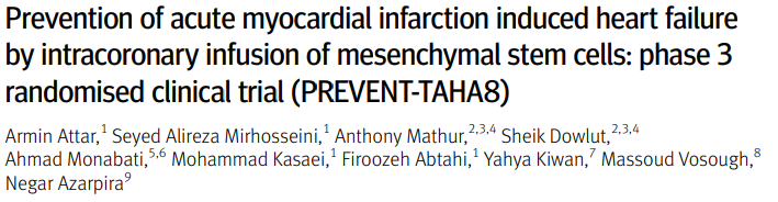 Armin Attar,Seyed Alireza Mirhosseini,Anthony Mathur.et al.Prevention of acute myocardial infarction induced heart failure by intracoronary infusion of mesenchymal stem cells: phase 3 randomised clinical trial (PREVENT-TAHA8). BMJ2025;391:e083382 http://dx.doi.org/10.1136/bmj-2024‑08338