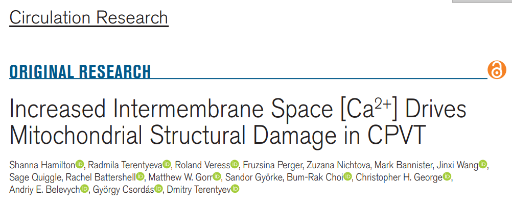 Hamilton S, Terentyeva R, Veress R, Perger F, Nichtova Z, Bannister M, Wang J, Quiggle S, Battershell R, Gorr MW, Györke S, Choi BR, George CH, Belevych AE, Csordás G, Terentyev D. Increased Intermembrane Space [Ca2+] Drives Mitochondrial Structural Damage in CPVT. Circ Res. 2025 Oct 23. doi: 10.1161/CIRCRESAHA.125.326841. Epub ahead of print. PMID: 41127903.