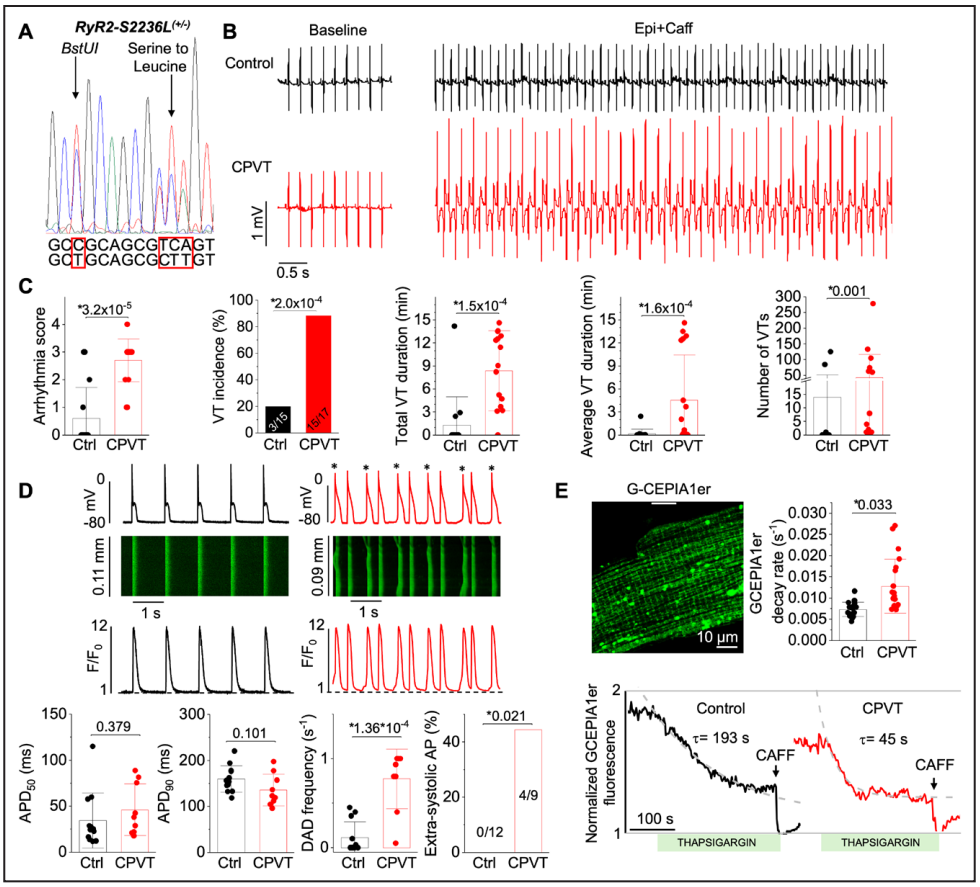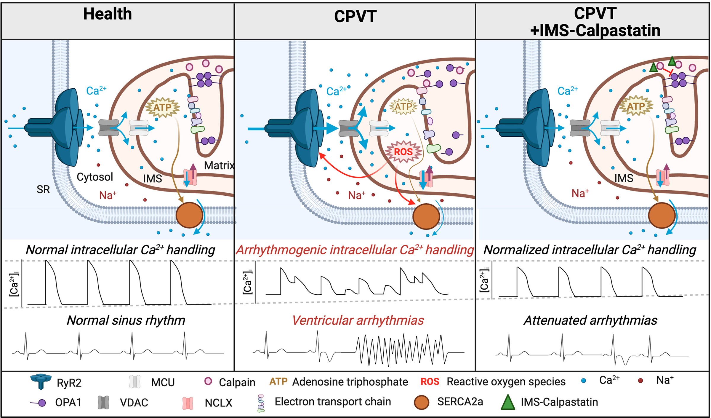 研究团队创造了首个携带RyR2功能获得性突变S2236L的CPVT大鼠模型,表现出典型的强致心律失常特征。开发了特异定位于线粒体膜间隙的钙离子荧光探针IMS-GECO1.2,结合电子显微镜、体外全心光学映射、多种基因编辑技术,系统研究了RyR2活性提高对膜间隙钙离子浓度、钙蛋白酶活性及线粒体结构的影响。