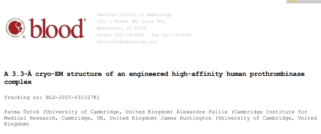 Üstok FI, Faille A, Huntington JA. A 3.3-Å cryo-EM structure of an engineered high-affinity human prothrombinase complex. Blood. 2025 Oct 27:blood.2025031527. doi: 10.1182/blood.2025031527. Epub ahead of print. PMID: 41144779.