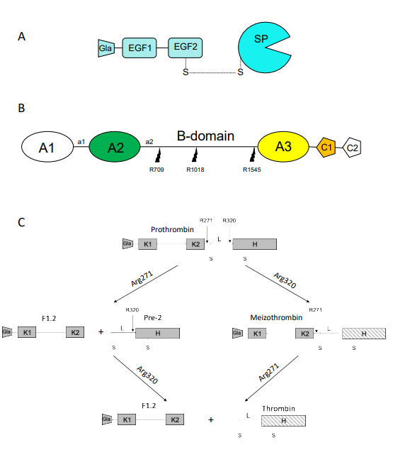 凝血因子 Ⅹa 和凝血因子 Ⅴ 结构域组织示意图以及凝血酶原加工途径