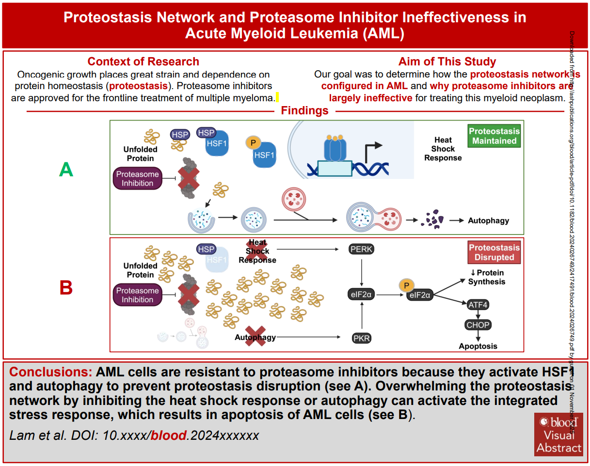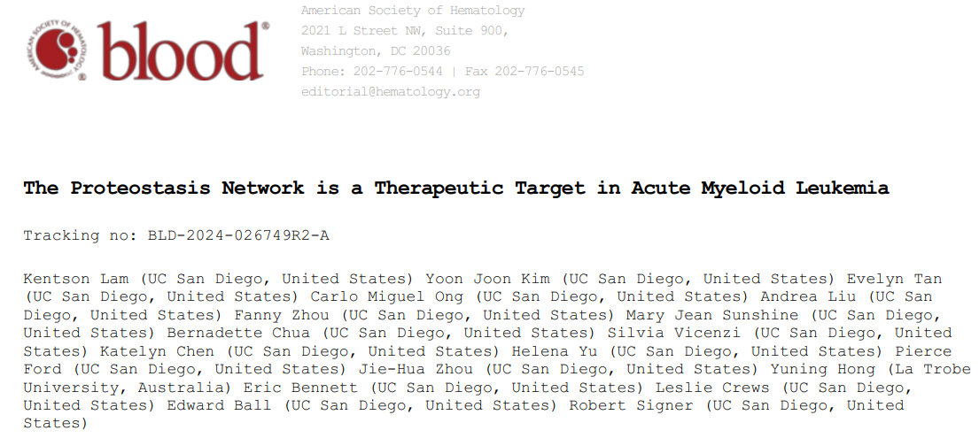 Lam K, Kim YJ, Tan EL, Ong CM, Liu AZ, Zhou FJ, Sunshine MJ, Chua B, Vicenzi S, Chen KZ, Yu H, Ford P, Zhou JH, Hong Y, Bennett EJ, Crews LA, Ball ED, Signer R. The Proteostasis Network is a Therapeutic Target in Acute Myeloid Leukemia. Blood. 2025 Oct 20:blood.2024026749. doi: 10.1182/blood.2024026749. Epub ahead of print. PMID: 41111393.