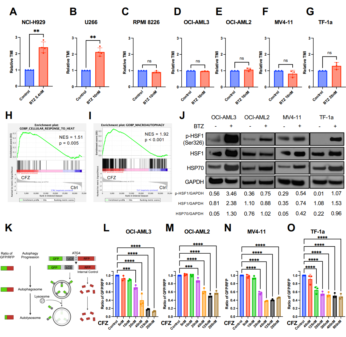RNA测序及基因富集分析显示AML细胞在蛋白酶体抑制后,热休克响应和自噬相关基因显著上调。Western免疫印迹证实HSF1激活(Ser326磷酸化)及其靶基因HSP70表达上升。双荧光报告基因实验揭示自噬流量增加,表明AML细胞通过激活这两条通路来抵御蛋白酶体抑制带来的蛋白稳态压力。