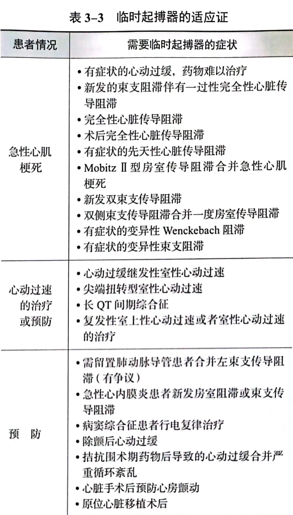 临时起搏器通常用于心脏手术术后药物治疗毒性反应所导致的心律失常、心肌梗死后继发的心律失常,以及β受体拮抗药导致的心动过缓。临时起搏器有时有助于围术期血流动力学的管理。术前电解质紊乱、使用β受体拮抗药和术中使用药物都可能加重心动过缓及继发的心律失常。相比于临时起搏器,心动过缓的药物治疗有许多缺点,因此血流动力学不稳定的围术期缓慢型心律失常是临时起搏器的适应证(表3-3)。