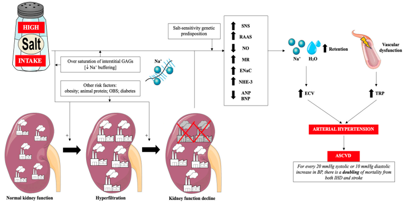 图:膳食盐过量影响高血压和心血管疾病发病机制的经典途径